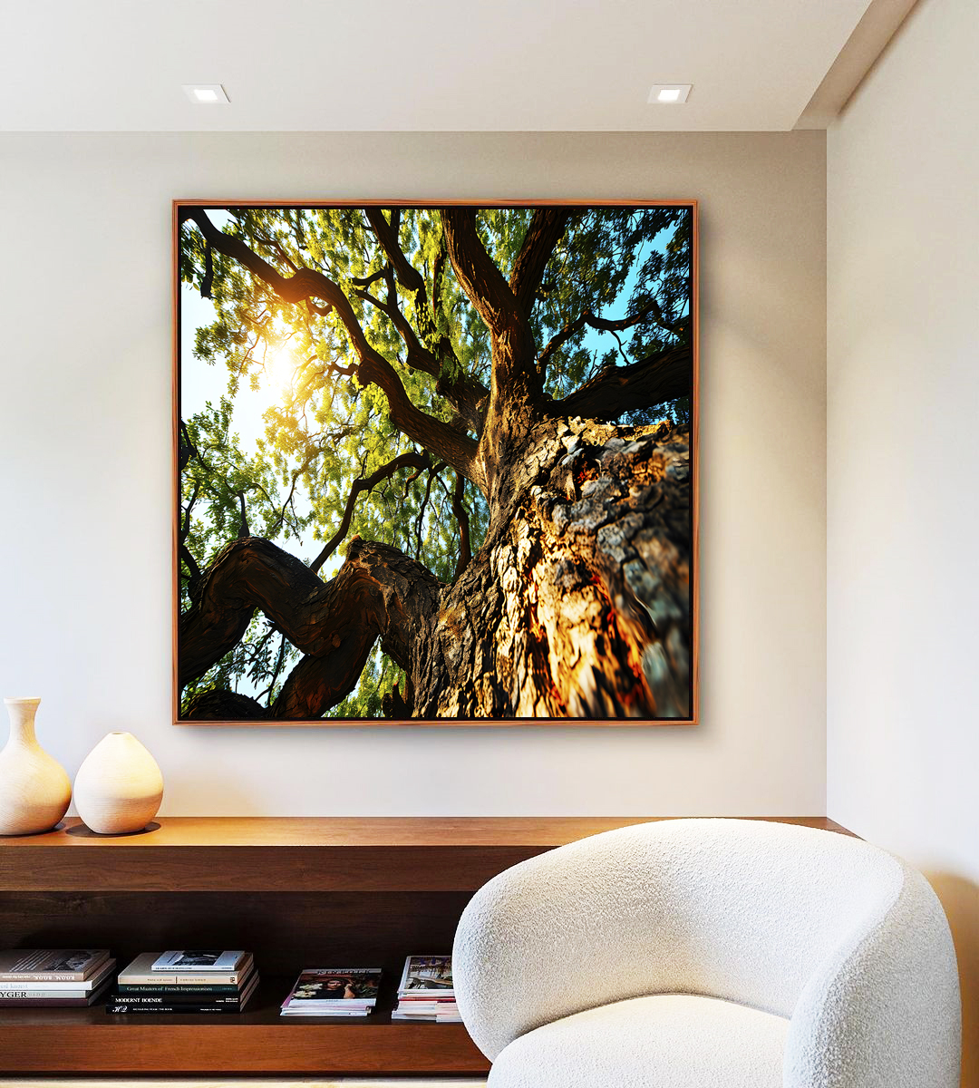 Este Quadro Quadrado com árvore e céu azul turquesa oferece equilíbrio visual e charme. Ótimo para espaços como quartos, halls e cantinhos de leitura e salas. Moldura flutuante moderna em canvas resistente. Estilo e Requinte.