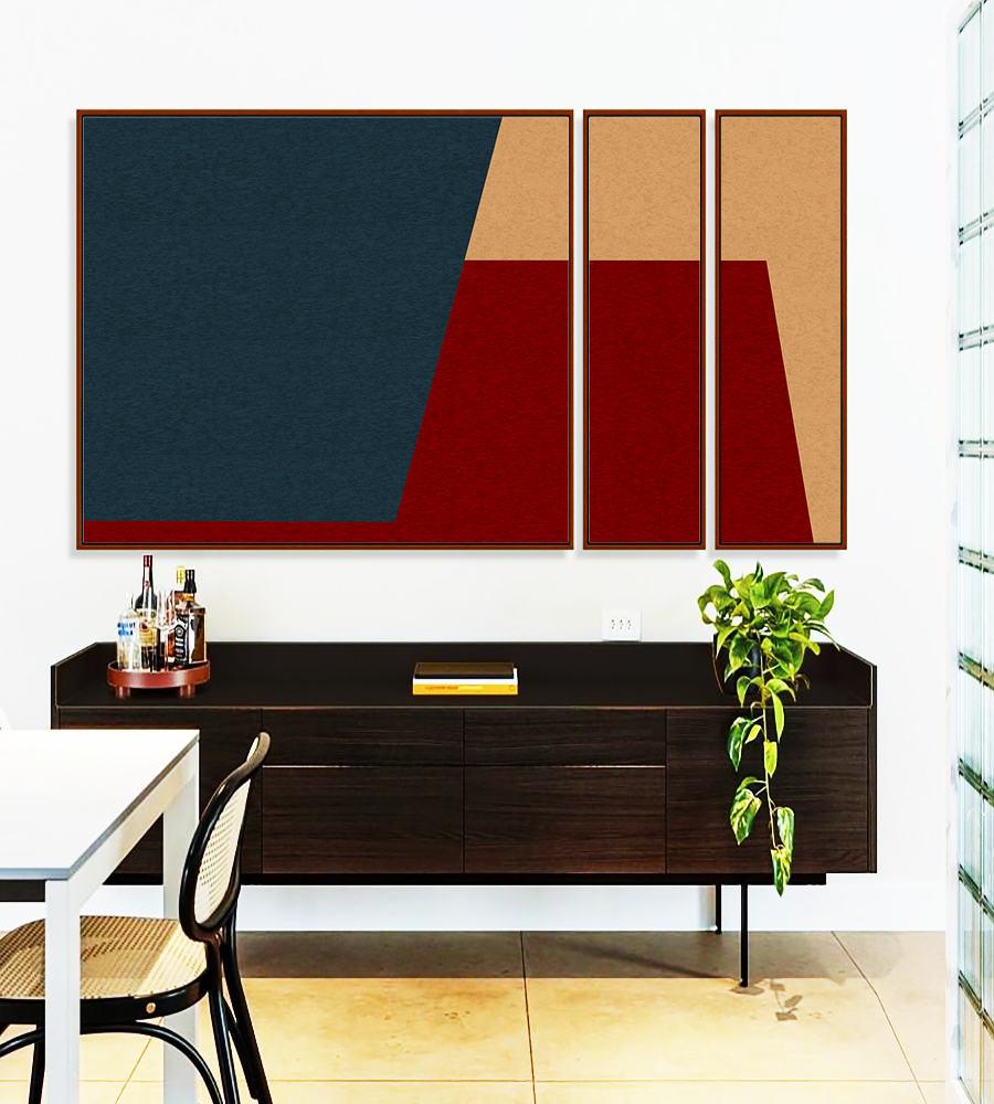 Este Trio de Quadros Estilizados abstrato minimalista combina tons de azul e vermelho em linhas geométricas modernas, despertando sofisticação e estilo. A escolha ideal para decorar sua sala, quarto ou escritório, trazendo charme e personalidade.