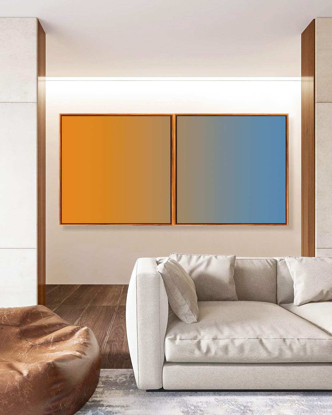 A combinação vibrante entre tons de laranja tangerina e azul cria uma atmosfera moderna e cheia de energia. Um Duo de Quadros Quadrados abstrato que traz vida e sofisticação. A escolha ideal para destacar sua sala, quarto ou escritório.