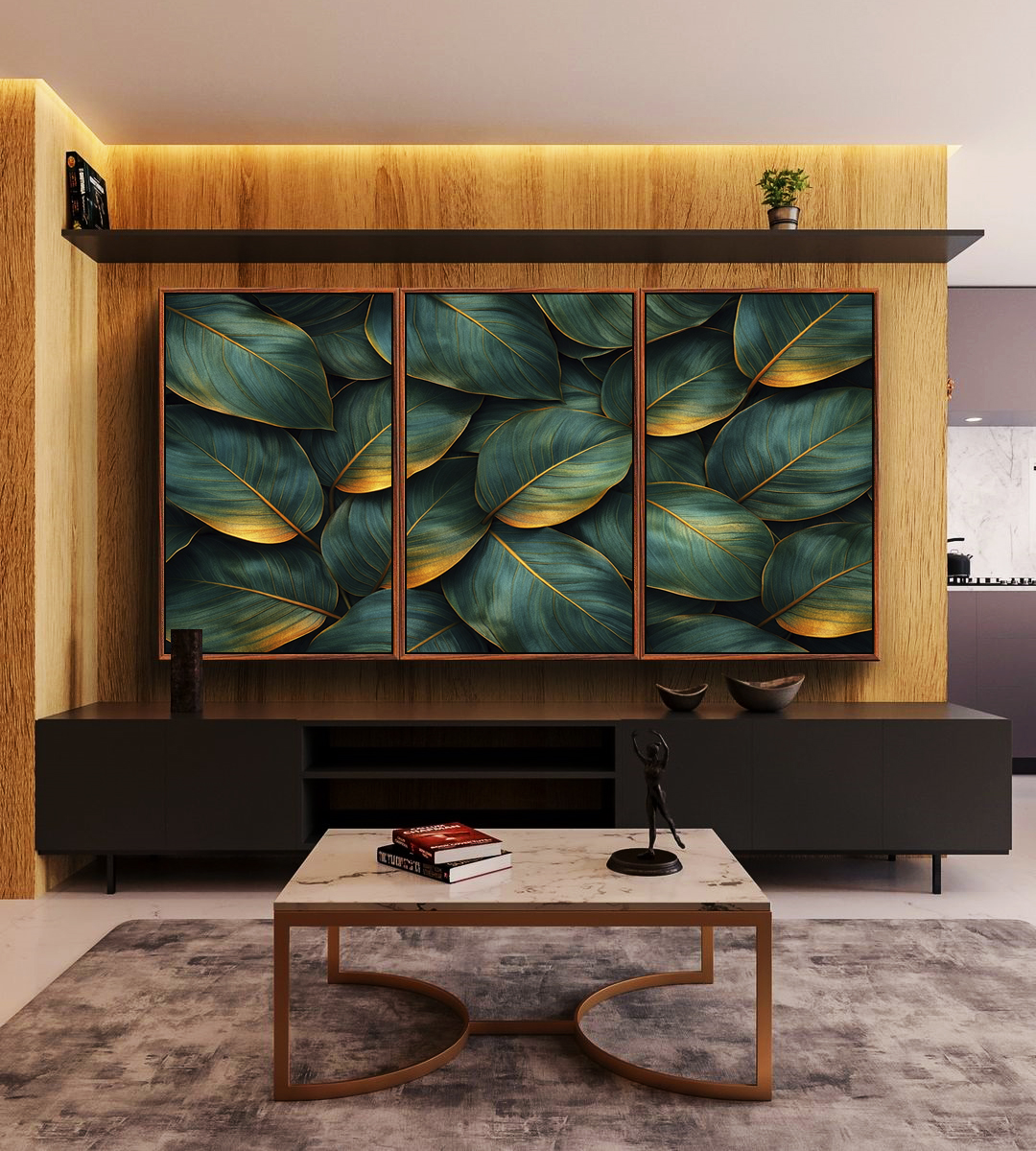 Trio de Quadros Folhas Plantas Verde Dourado Tropical Natureza Canvas Moldura