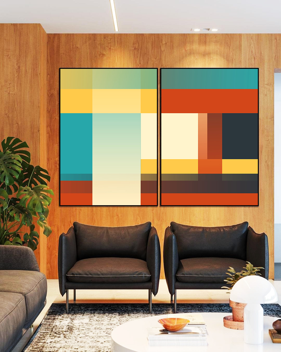 Duo de Quadros Abstrato Mosaico Degradê Azul Amarelo Vermelho Canvas Moldura