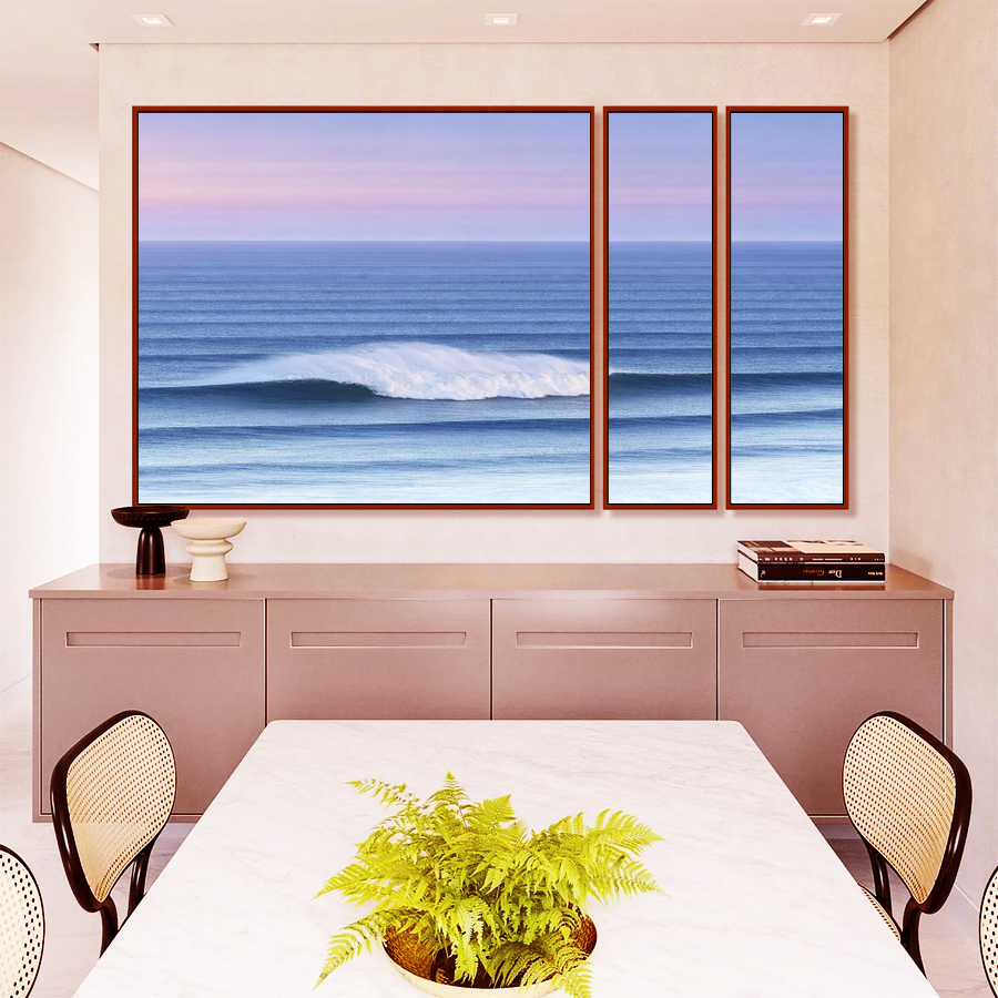 Com ondas delicadas e tons de azul profundo sob um céu lilás suave, esta obra transmite calma e elegância. O Trio de Quadros Estilizados é ideal para decorar salas de estar, escritórios refinados ou quartos, criando um ambiente iluminado.
