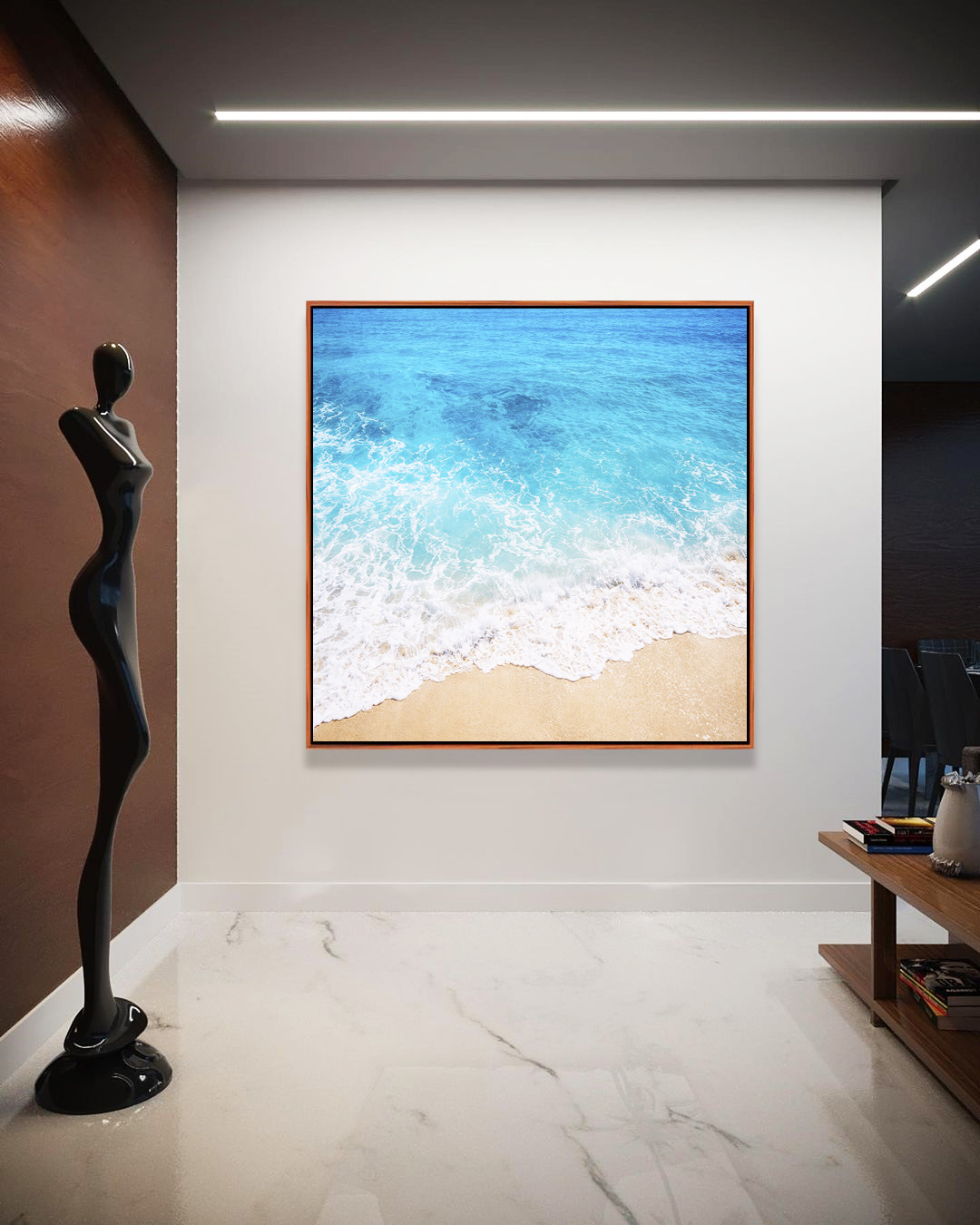 Praia com mar cristalino, reflexos do sol e espuma delicada na areia. Perfeito para ambientes como sala, quarto, escritório ou espaço comercial. Estilo natural e sofisticado que valoriza a decoração com leveza e luz.