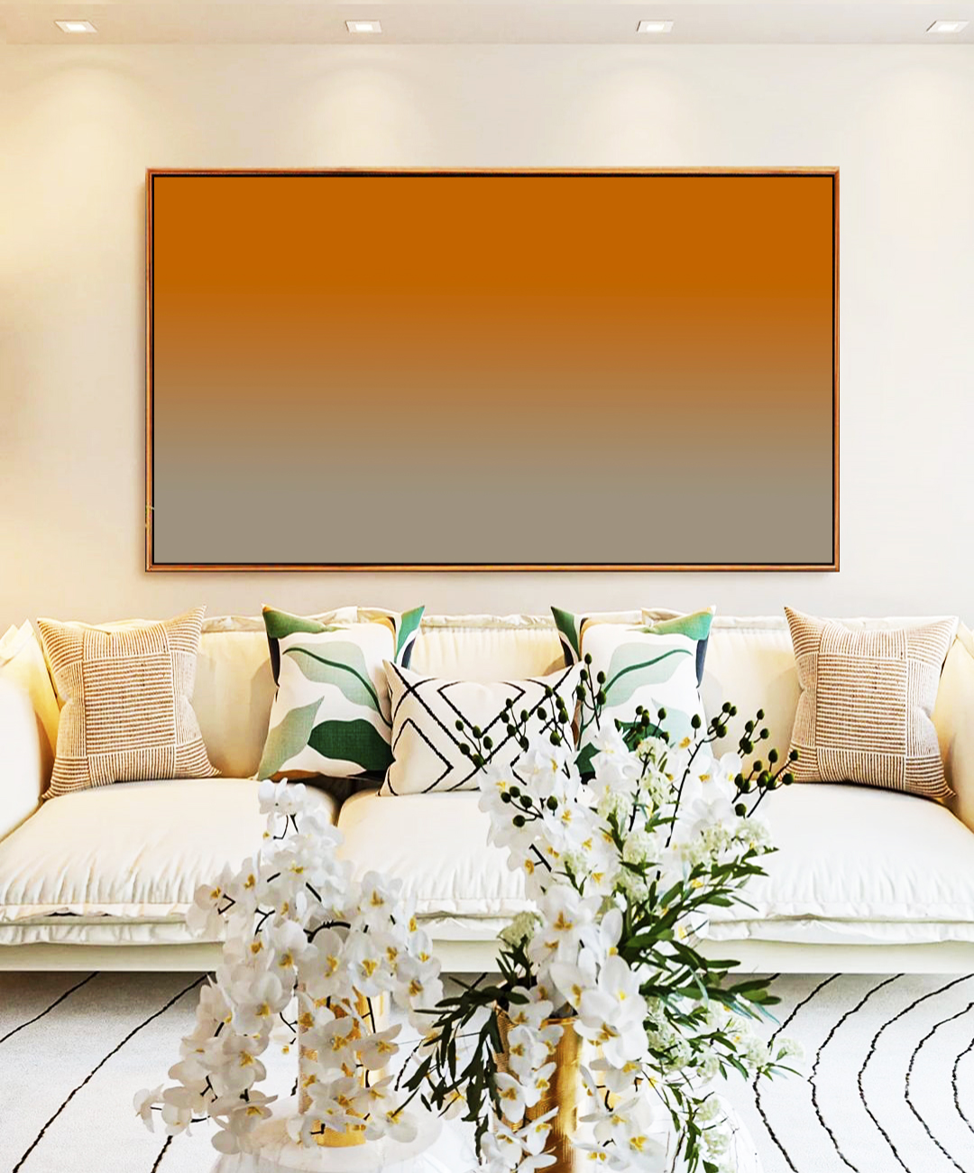 Degradê abstrato em cinza e laranja tangerina que traz energia e elegância ao ambiente. Ideal para salas modernas, escritórios criativos e espaços com personalidade.