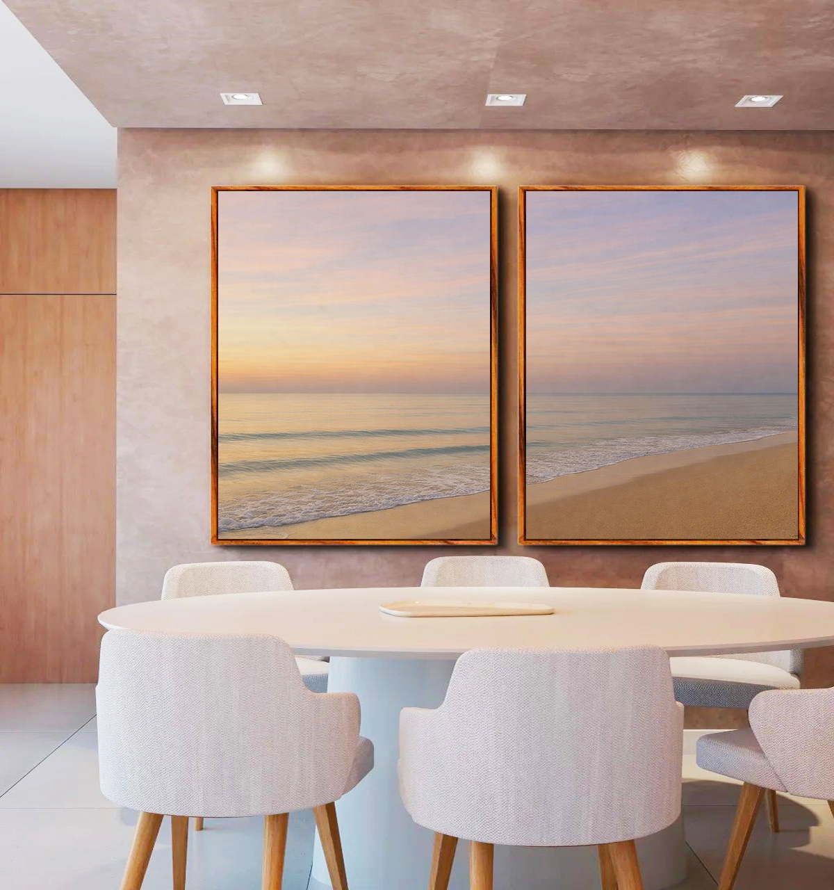 Sereno e encantador, este Duo de Quadros com nascer do sol lilás sobre praia serena e mar azul prateado cria atmosfera leve e sofisticada. A escolha ideal para salas elegantes, quartos tranquilos, ou escritórios modernos.