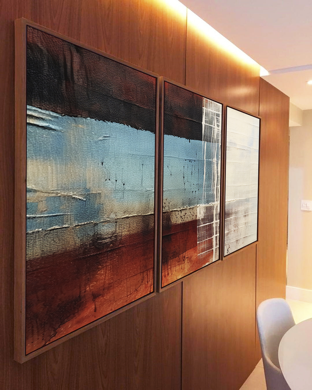 Este Trio de Quadros abstratos em terracota, azul e preto apresenta textura marcante que transforma a decoração. Com moldura flutuante, traz equilíbrio e impacto visual, perfeito para valorizar sala de estar, quarto, hall ou escritório sofisticado.