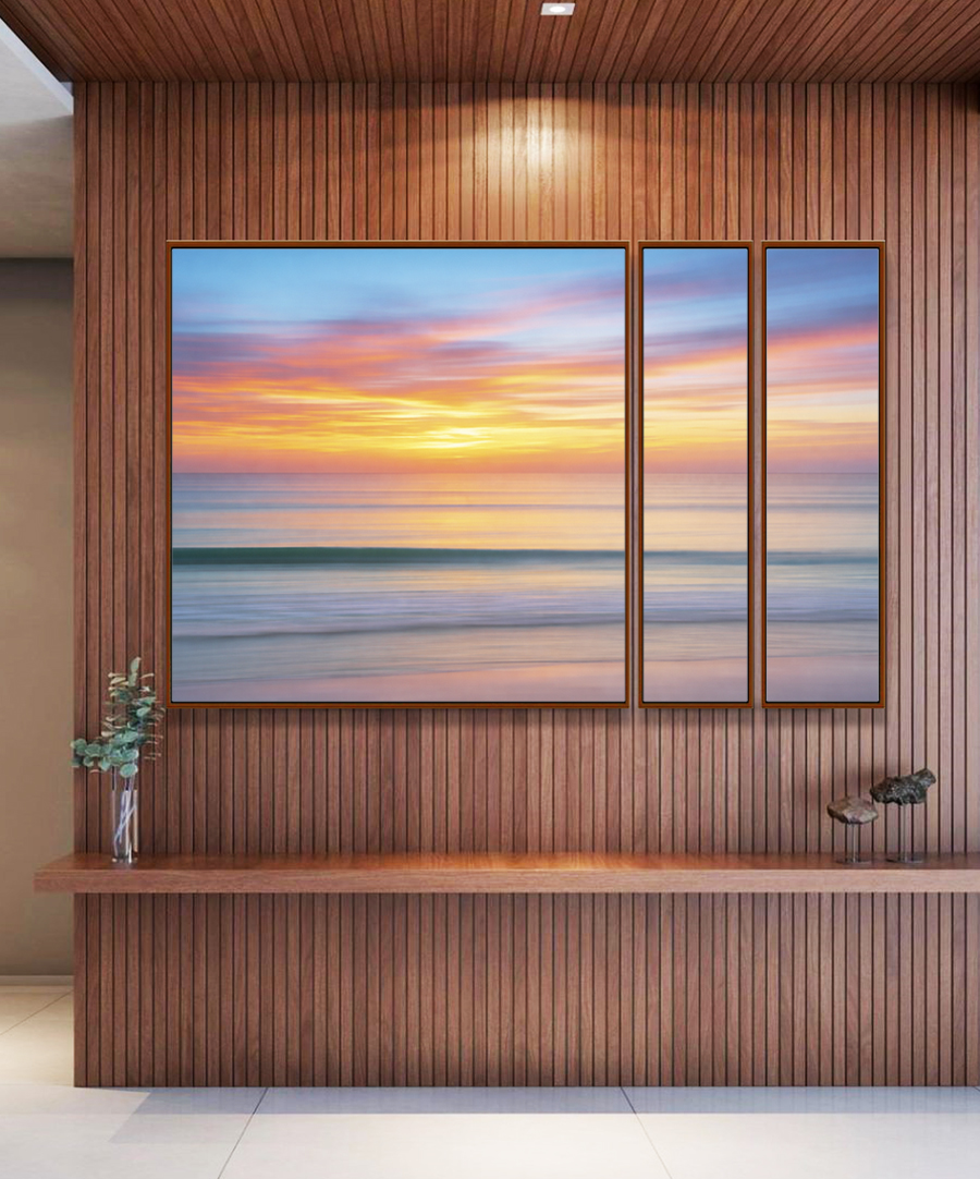 O mar em tons prateados encontra o céu em nuances de laranja e azul, criando uma atmosfera fluida e envolvente. Ideal para salas, quartos e ambientes que buscam leveza, movimento e bem-estar.