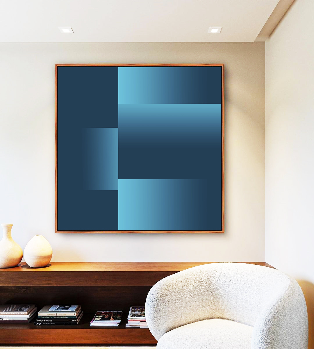 Com Arte geométrica e degradê em tons de azul, este Quadro Quadrado transmite modernidade e serenidade. A escolha certa para salas amplas, quartos refinados ou halls de entrada, valorizando o ambiente com arte abstrata e visual marcante.