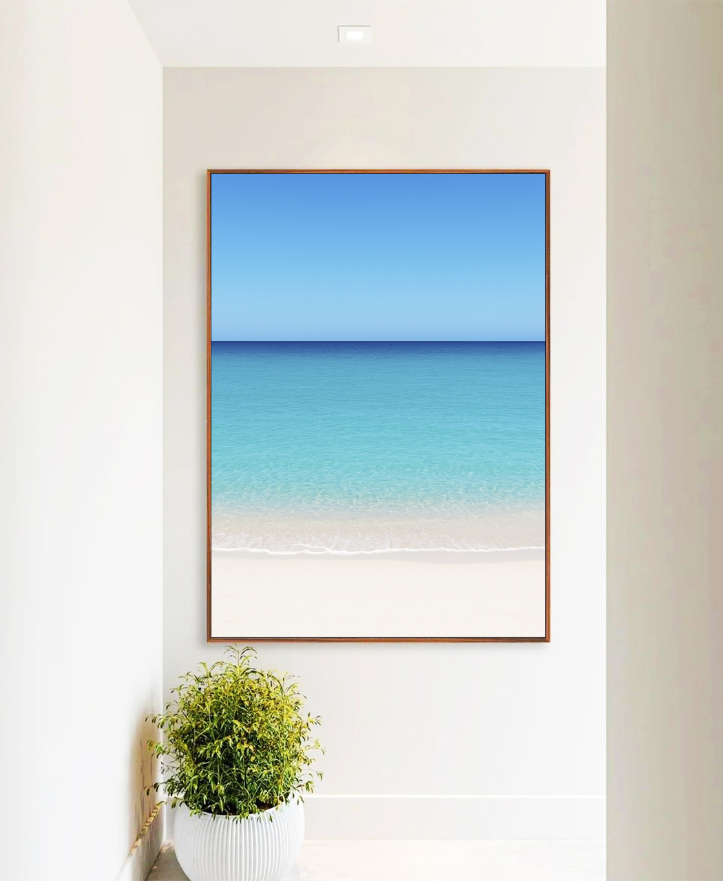 Este Quadro Vertical retrata a serenidade do mar azul e o brilho do céu limpo, evocando calma e harmonia. Perfeito para transformar salas, escritórios ou quartos em espaços relaxantes e elegantes.
