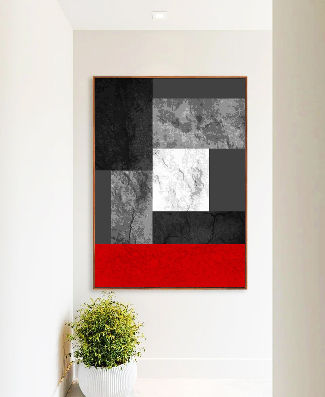 Abstrato geométrico com cinza concreto e vermelho, trazendo equilíbrio entre modernidade, elegância e impacto visual. Estilo contemporâneo ideal para quem busca decoração urbana e sofisticada.