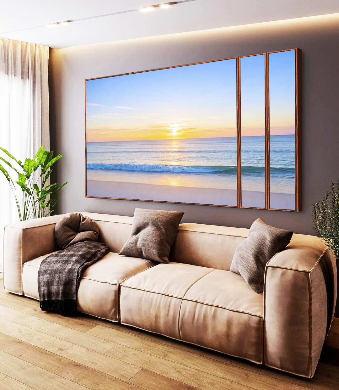 Leve e inspirador, este Trio de Quadros Estilizados retrata a natureza litorânea com mar azul claro e céu aberto ao nascer do sol, arte cheia de harmonia. A escolha ideal para quartos tranquilos, escritórios sofisticados ou salas elegantes.