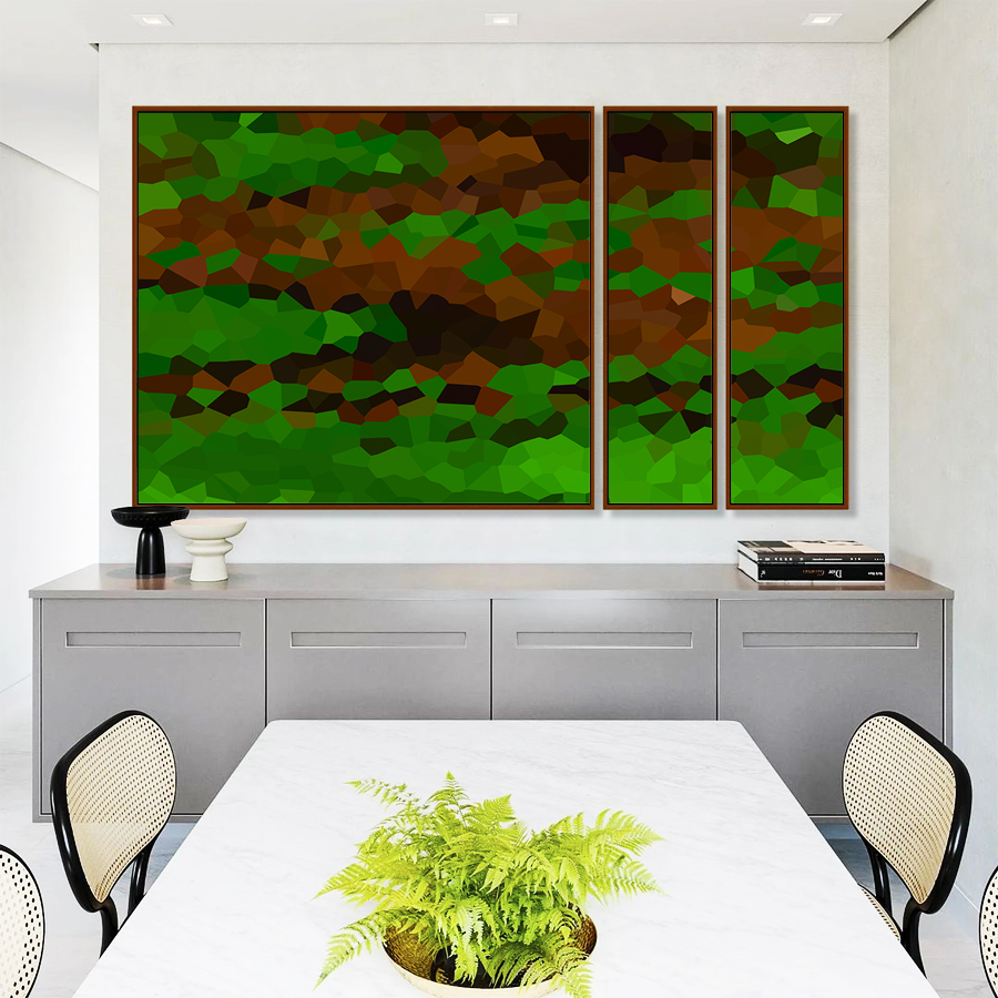Trio de Quadros Estilizados abstrato em mosaico com tons de verde e marrom, criando equilíbrio e sofisticação. A escolha ideal para salas de estar, quartos elegantes, escritórios modernos ou halls de entrada, trazendo aconchego e estilo.