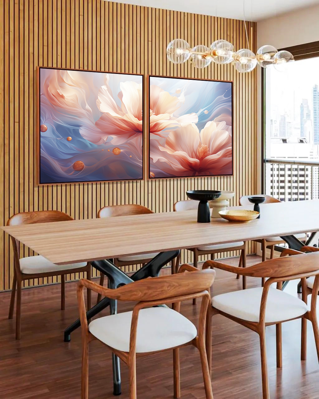 Elegância pura: Duo de Quadros Quadrados com arte fluida de flores brancas, rosas e azul. Moldura Extra Fina Flutuante com impressão em Canvas de alta qualidade. Ideal para salas elegantes, escritórios com requinte ou halls cheios de personalidade.