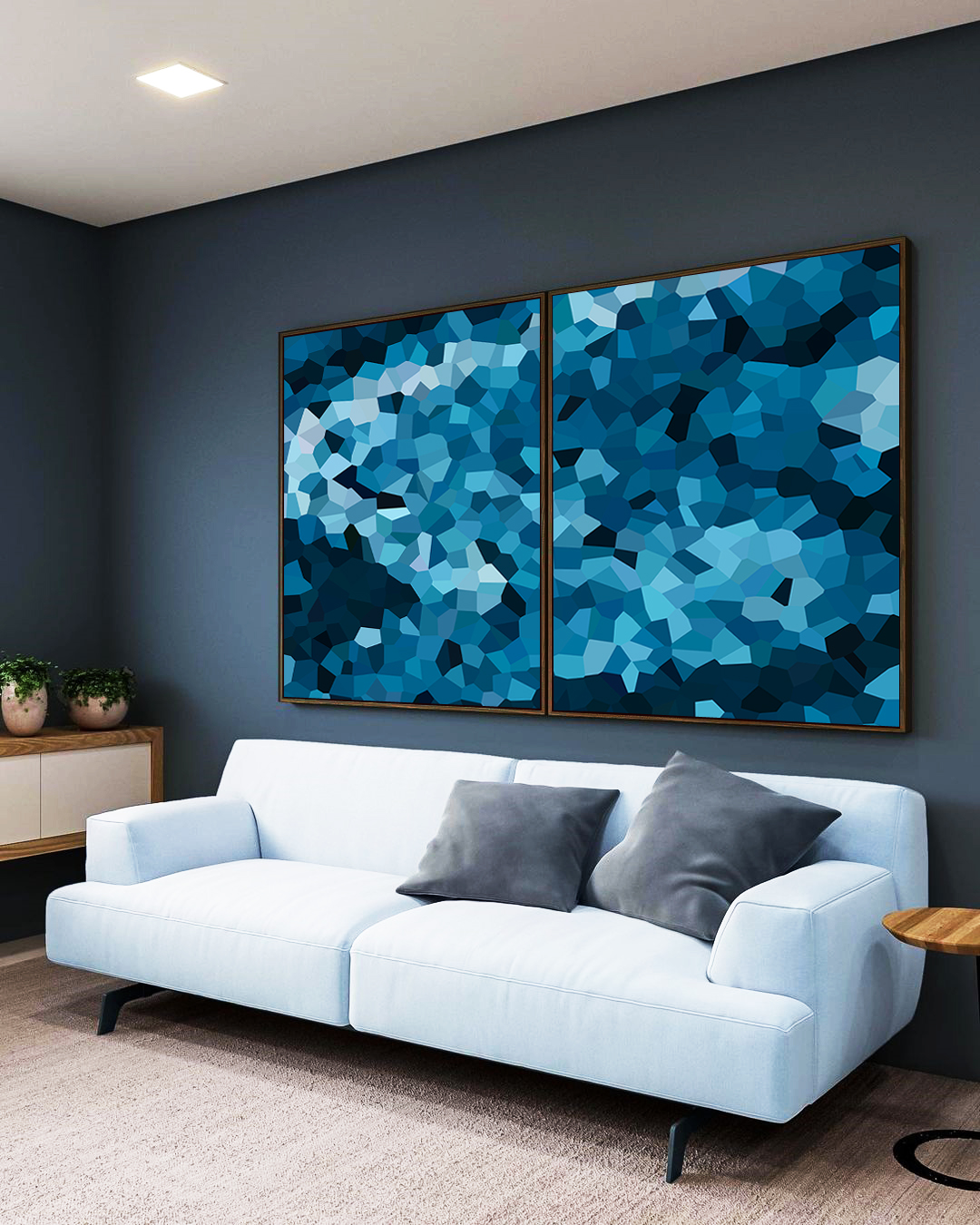 Duo de Quadros Abstrato Mosaico Azul Marinho Claro Canvas Moldura