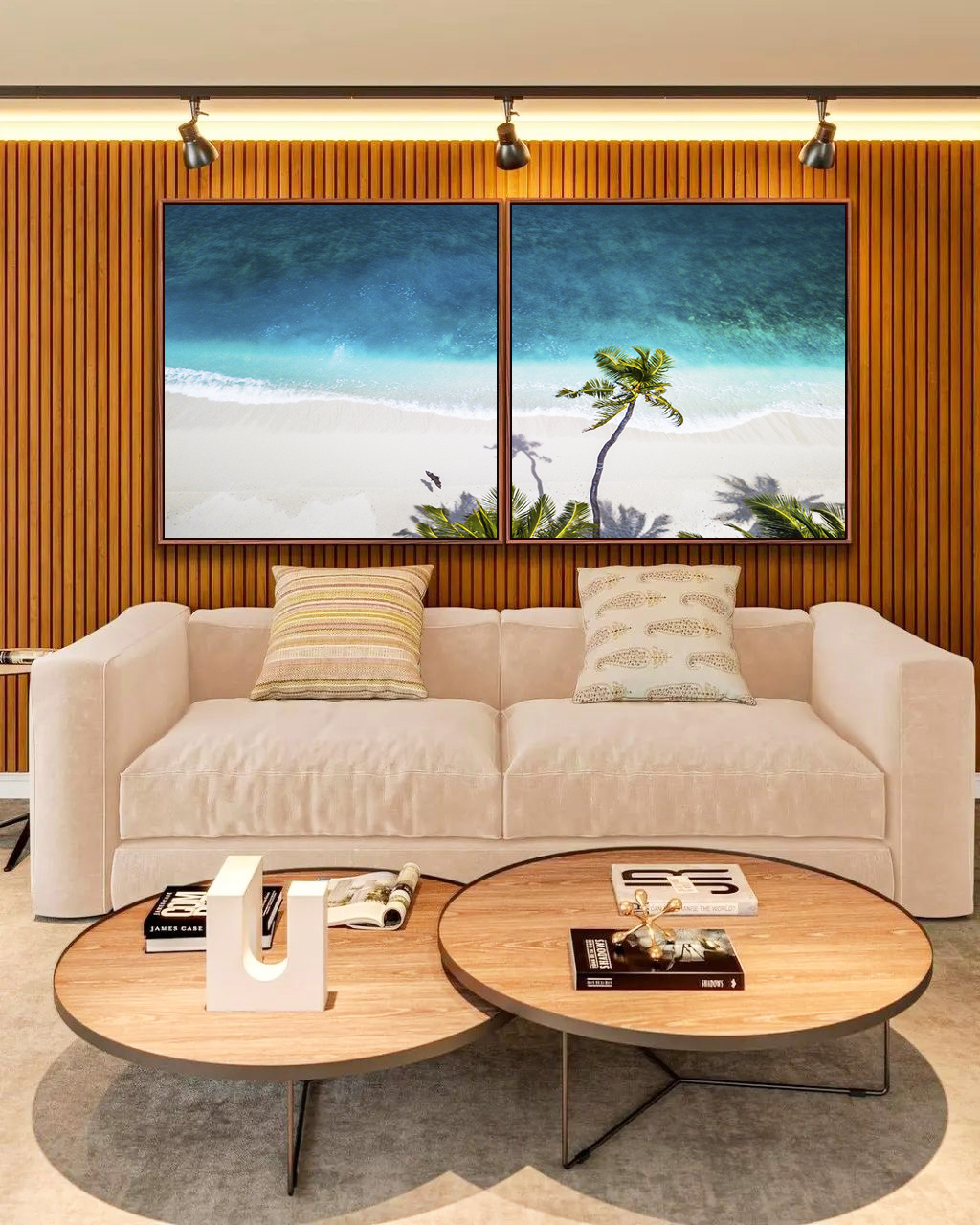 Este Duo de Quadros Quadrados, com mar azul intenso e coqueiro sobre areia branca, inspira paz e frescor. Ideal para decorar salas, quartos ou halls de entrada, criando um ambiente sereno e refinado. Perfeito para quem busca equilíbrio e estilo.