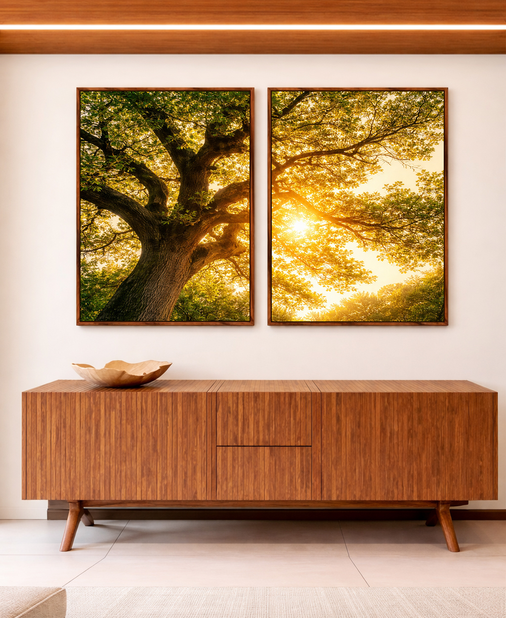 Árvore iluminada por luzes douradas do sol, criando uma atmosfera quente e serena. Ideal para sala, quarto ou ambientes que pedem aconchego, paz e conexão com a natureza.