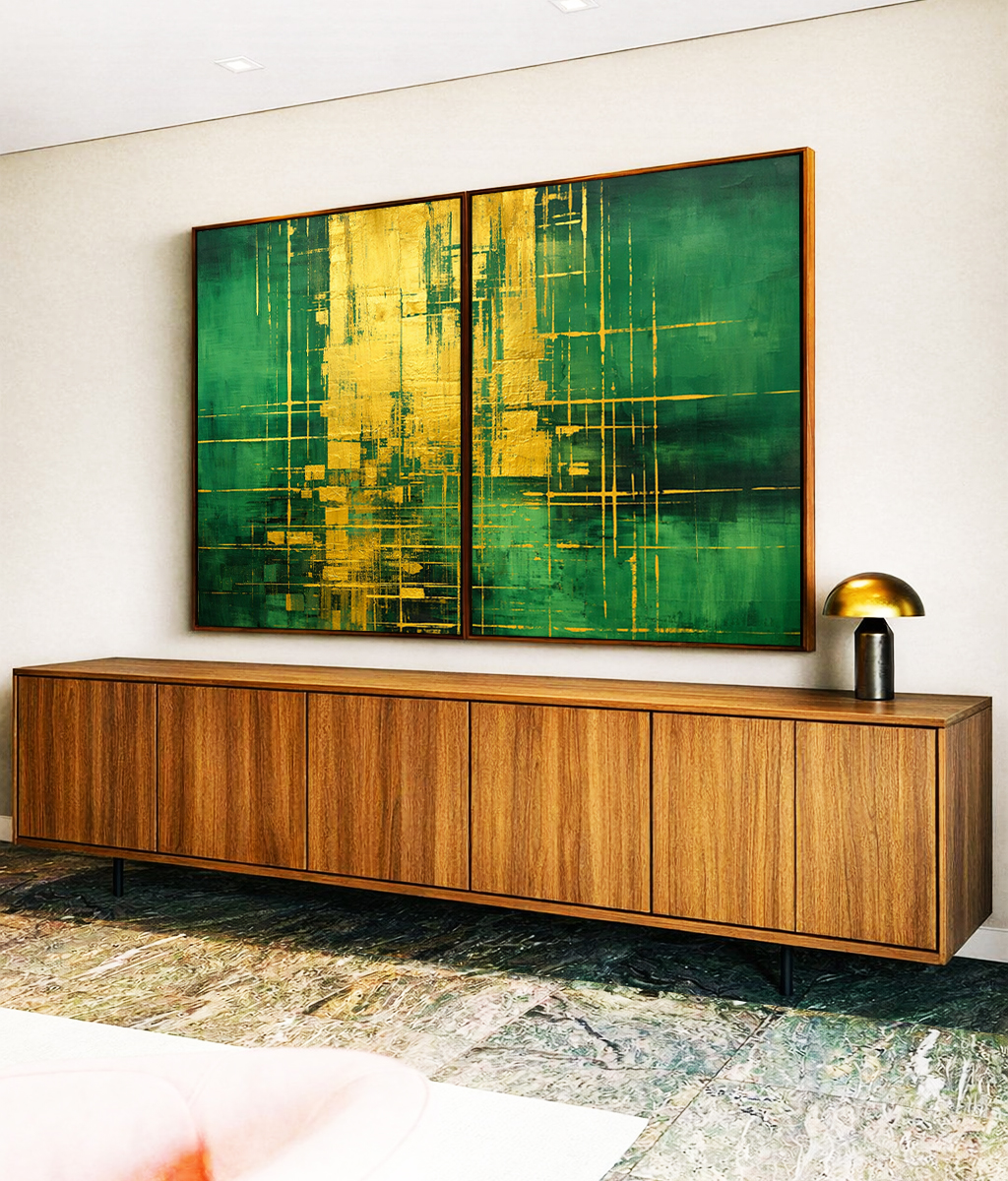 Tons intensos de verde escuro com dourado criam um visual abstrato luxuoso e contemporâneo. O efeito pintura adiciona textura e destaque, trazendo personalidade para salas, quartos e espaços que buscam um toque elegante e imponente.