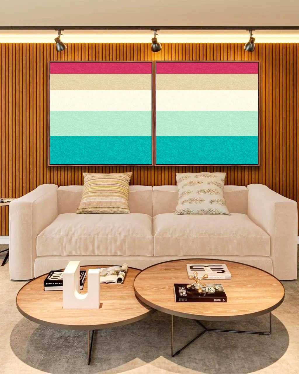 Com listras em tons de rosa e turquesa, este Duo de Quadros Quadrados abstrato traz equilíbrio e sofisticação à decoração.