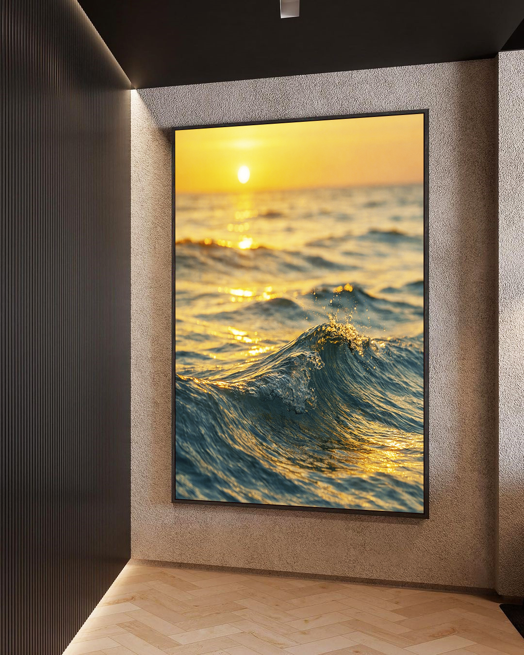 Pôr do sol sobre o mar com ondas suaves e brilho prateado que transmite paz e elegância. Ideal para sala de estar, quarto, escritório, consultório ou casa de praia. Perfeito para decoração litorânea, estilo contemporâneo e ambientes relaxantes.