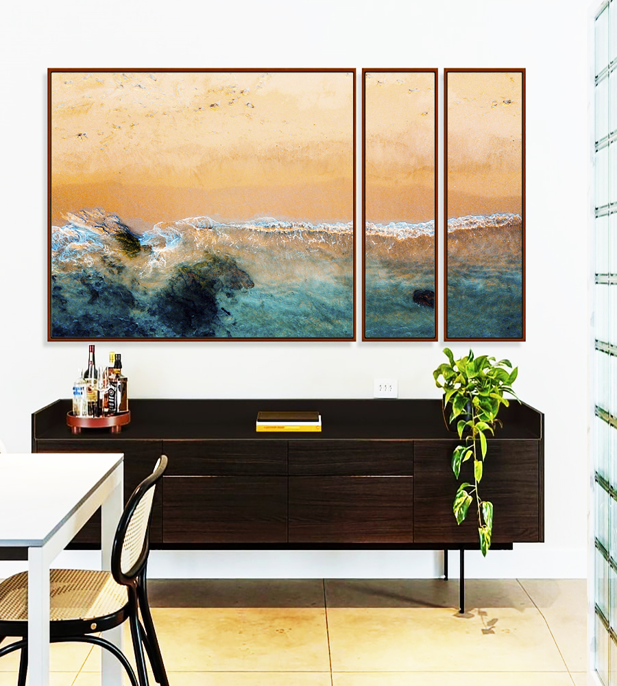 Com mar turquesa intenso e pedras naturais, este Trio de Quadros Estilizados adiciona frescor e charme tropical ao espaço.