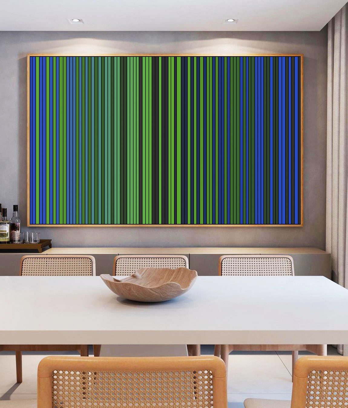 O Quadro Horizontal Abstrato em degradê com listras verde esmeralda e azul marinho transmite elegância e modernidade. A Moldura Moderna realça os detalhes da arte, perfeita para renovar com requinte sua Sala de Estar, Quarto ou Escritório.