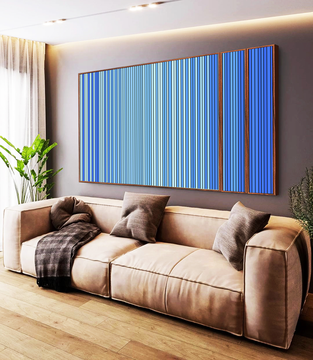 Encante seus ambientes com este Trio de Quadros Estilizados Abstratos. Degradê em listras azul bebê e azul royal com Moldura Moderna cria impacto visual. Ideal para salas de estar sofisticadas, quartos elegantes ou escritórios inspiradores.