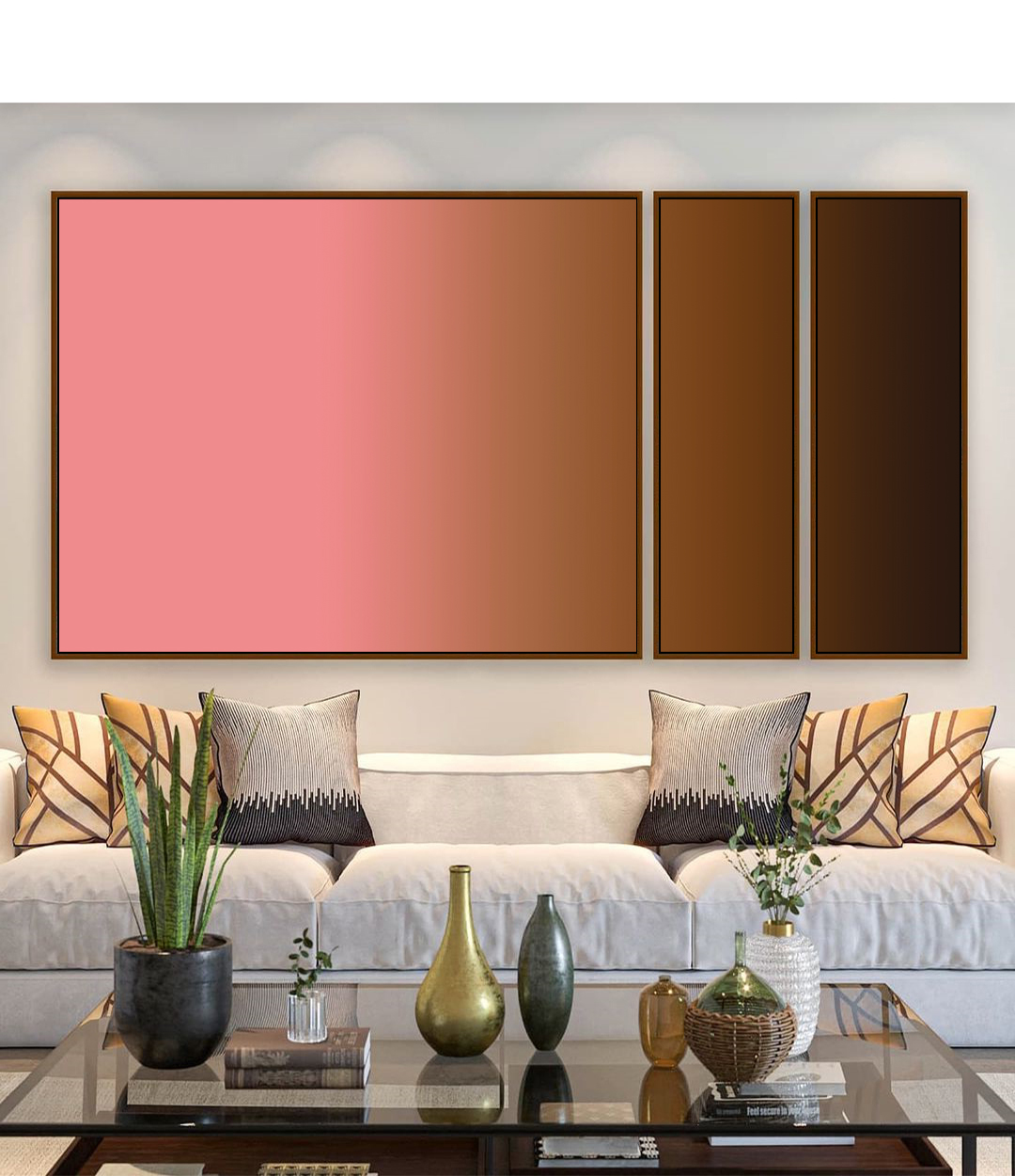 Trio de Quadros Estilizados Abstrato Degradê Rosa Antigo Marrom Chocolate Canvas Moldura