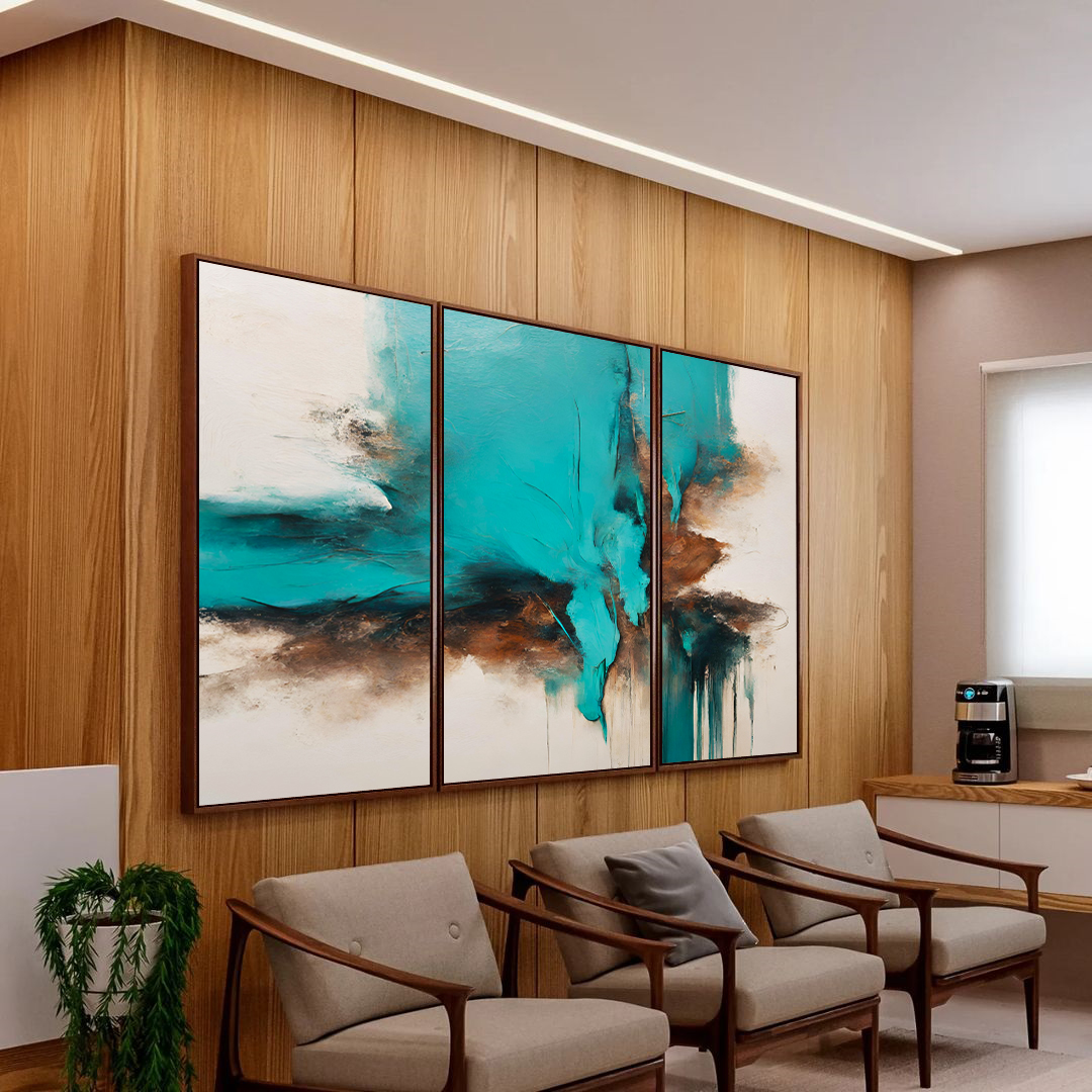 A combinação perfeita para sua parede! O Trio de Quadros abstratos com tons turquesa, marrom e branco proporciona uma decoração moderna e elegante. Feitos em canvas de alta definição, com moldura premium para um acabamento impecável.