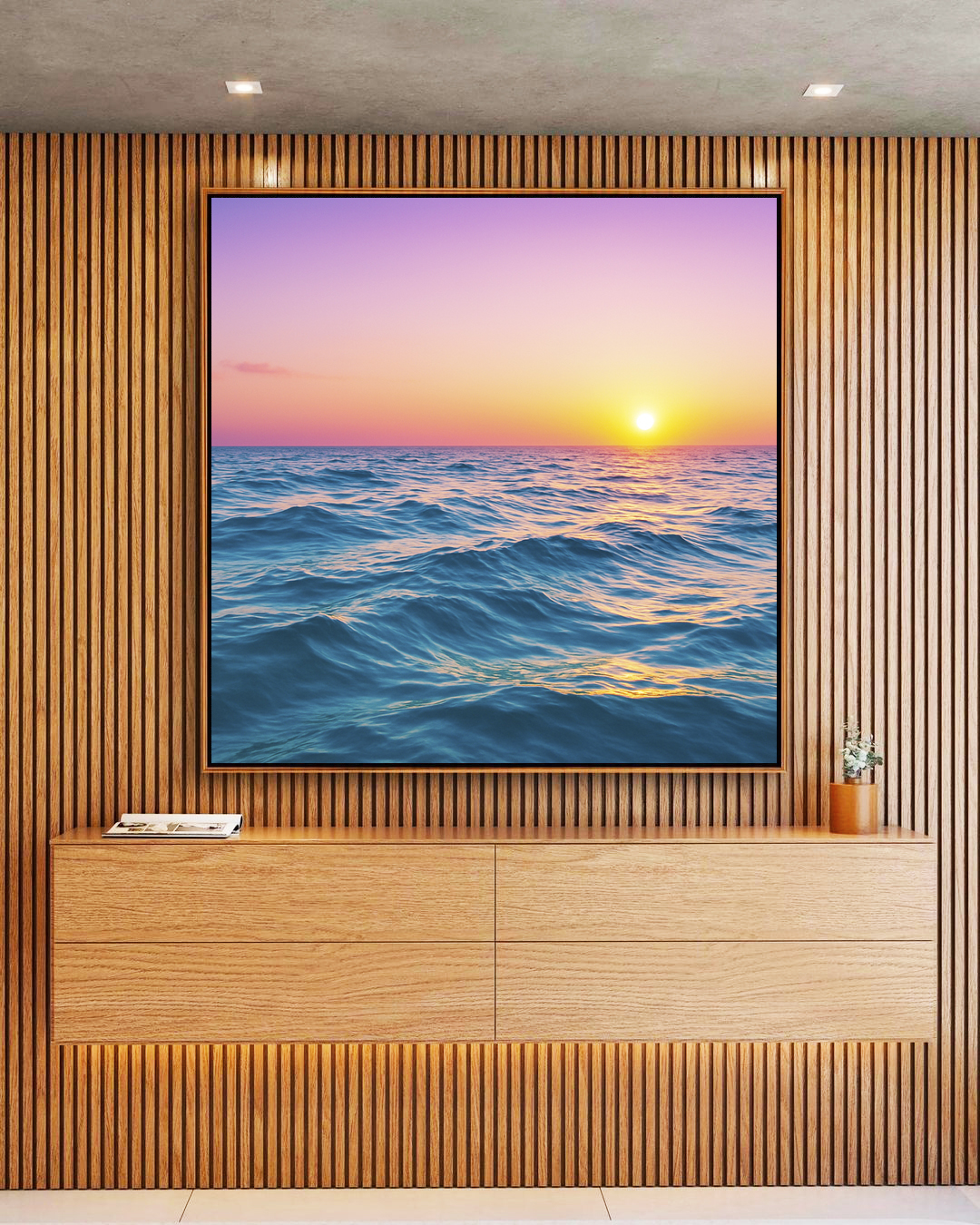 O Quadro Quadrado retrata um mar azul sereno banhado pela luz rosada do sol, evocando paz e equilíbrio.