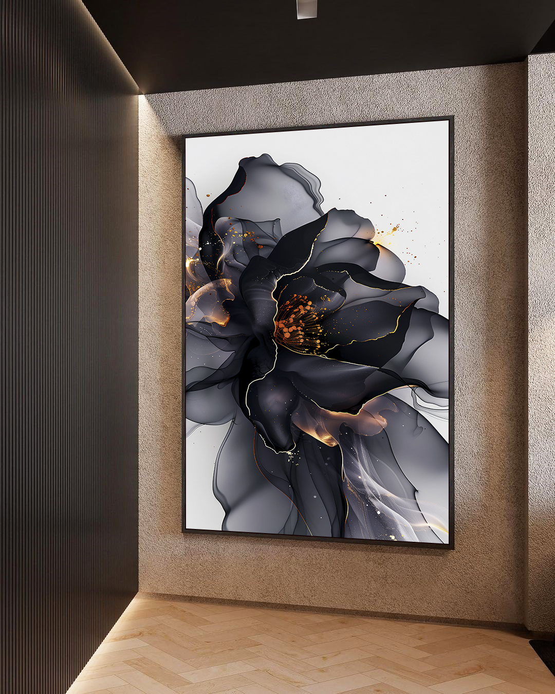 Um toque de arte moderna para sua decoração. Este Quadro Vertical exibe uma flor abstrata em tons fumê com dourado e branco, trazendo sofisticação. Perfeito para compor salas, quartos, escritórios ou halls de entrada com moldura flutuante elegante.
