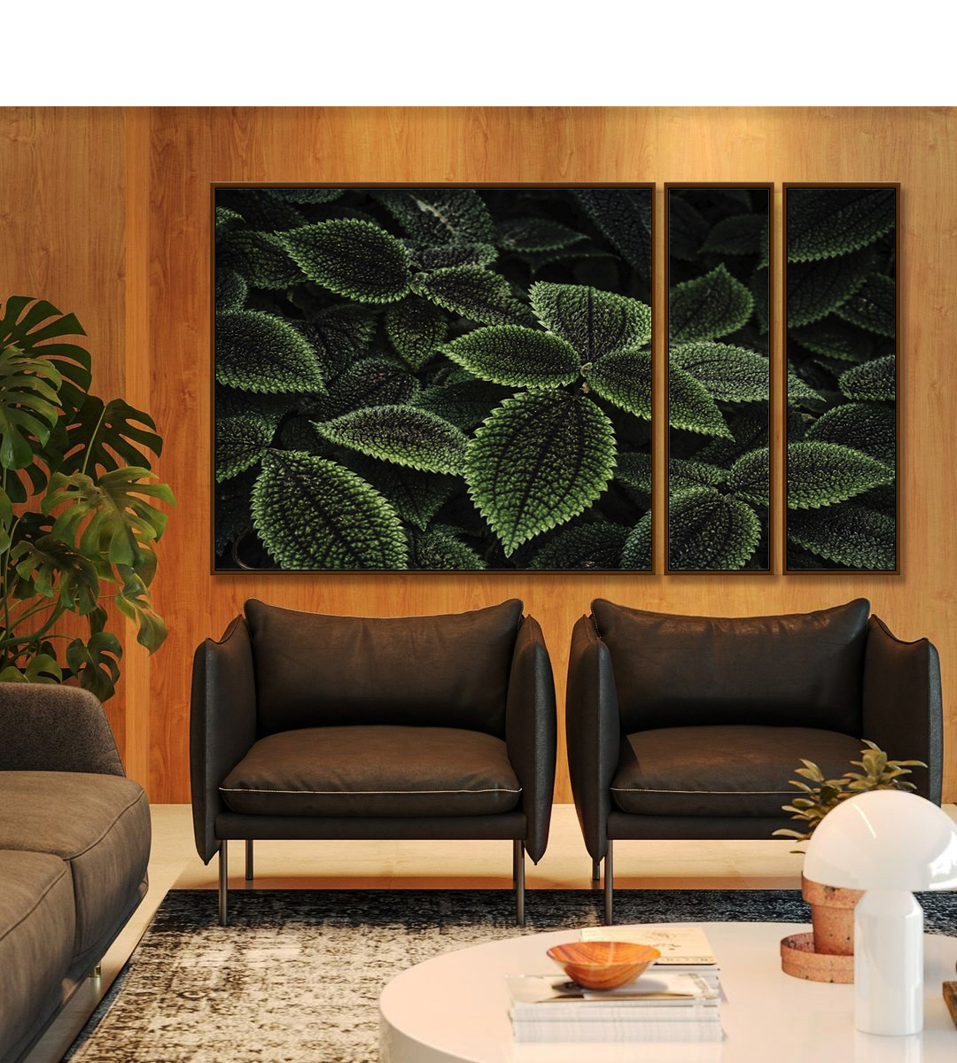 Marcante e harmonioso, este Trio de Quadros Estilizados com folhas verdes texturizadas de Pilea destaca a beleza da natureza com elegância. Ideal para compor salas refinadas, quartos acolhedores, escritórios modernos ou halls imponentes.