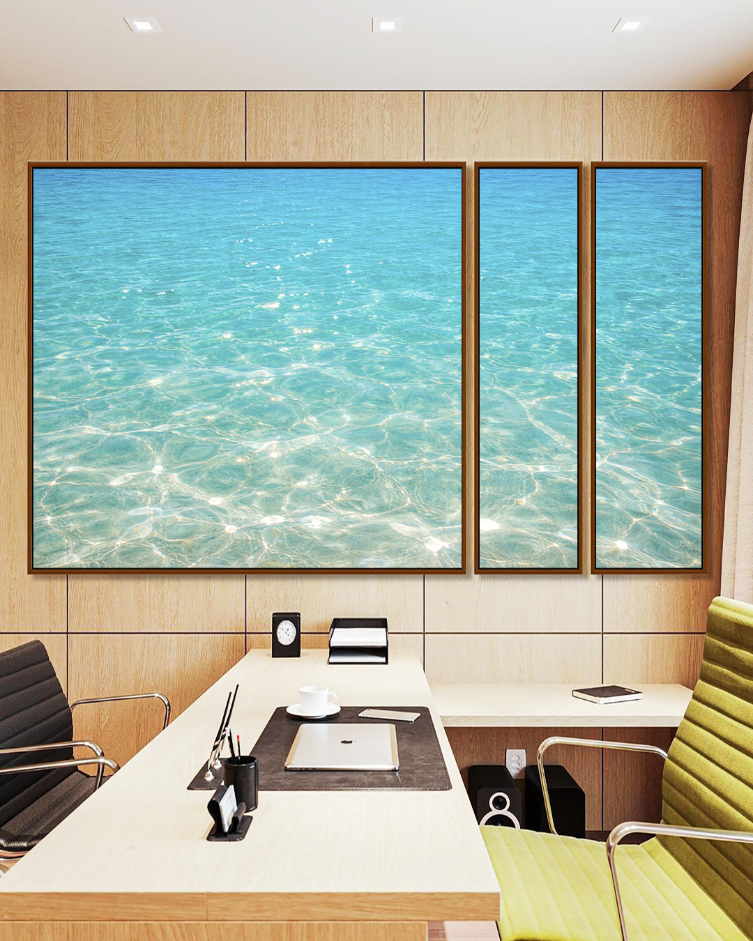 Mar azul cristalino com reflexos do sol, água transparente e sensação de frescor. Ideal para sala, quarto, escritório, hall ou ambientes de praia. Decoração leve, relaxante e natural, perfeita para trazer paz, luz e clima litorâneo ao espaço.