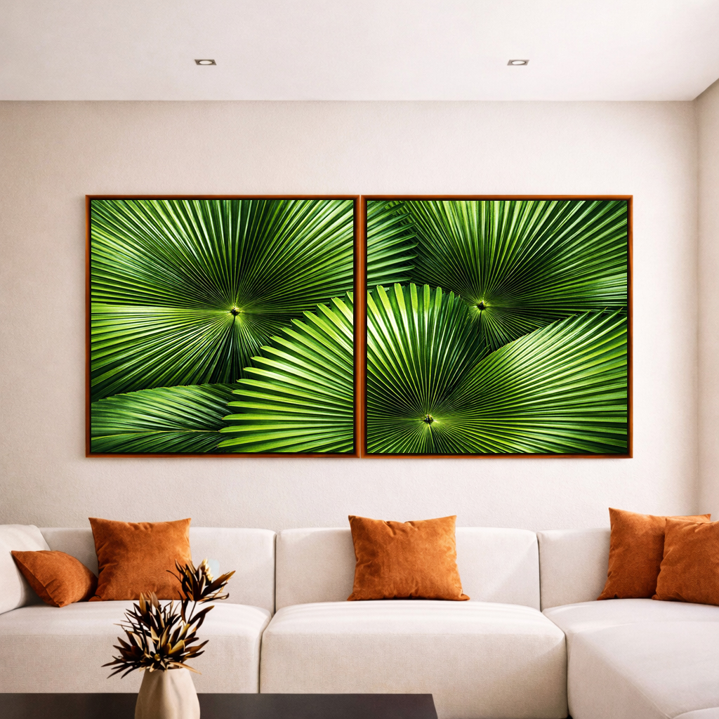 Duo de Quadros Quadrados Planta Palmeira-Leque Verde Folhagem Natureza Canvas Moldura